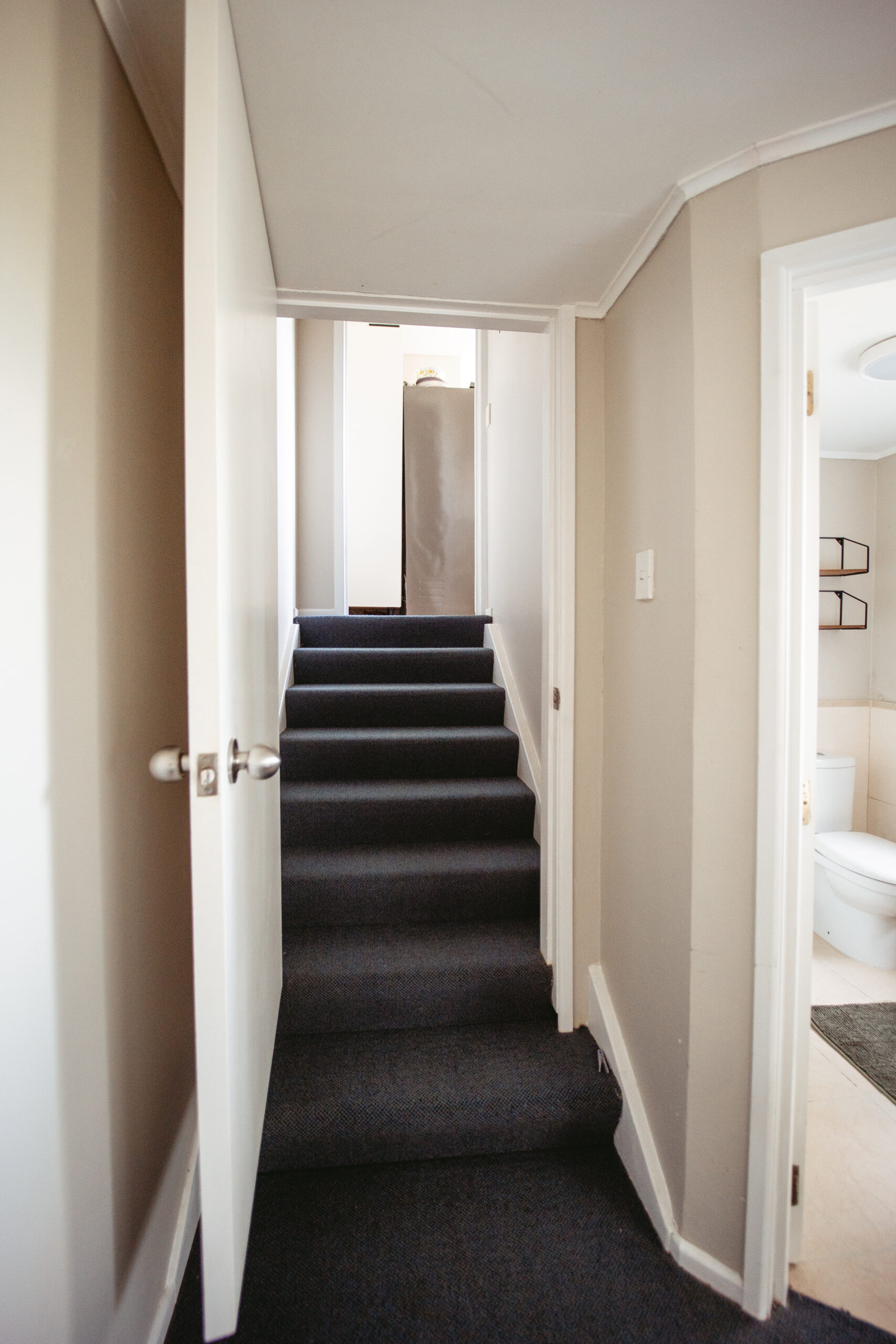 Stairs up to kitchen with locking door.